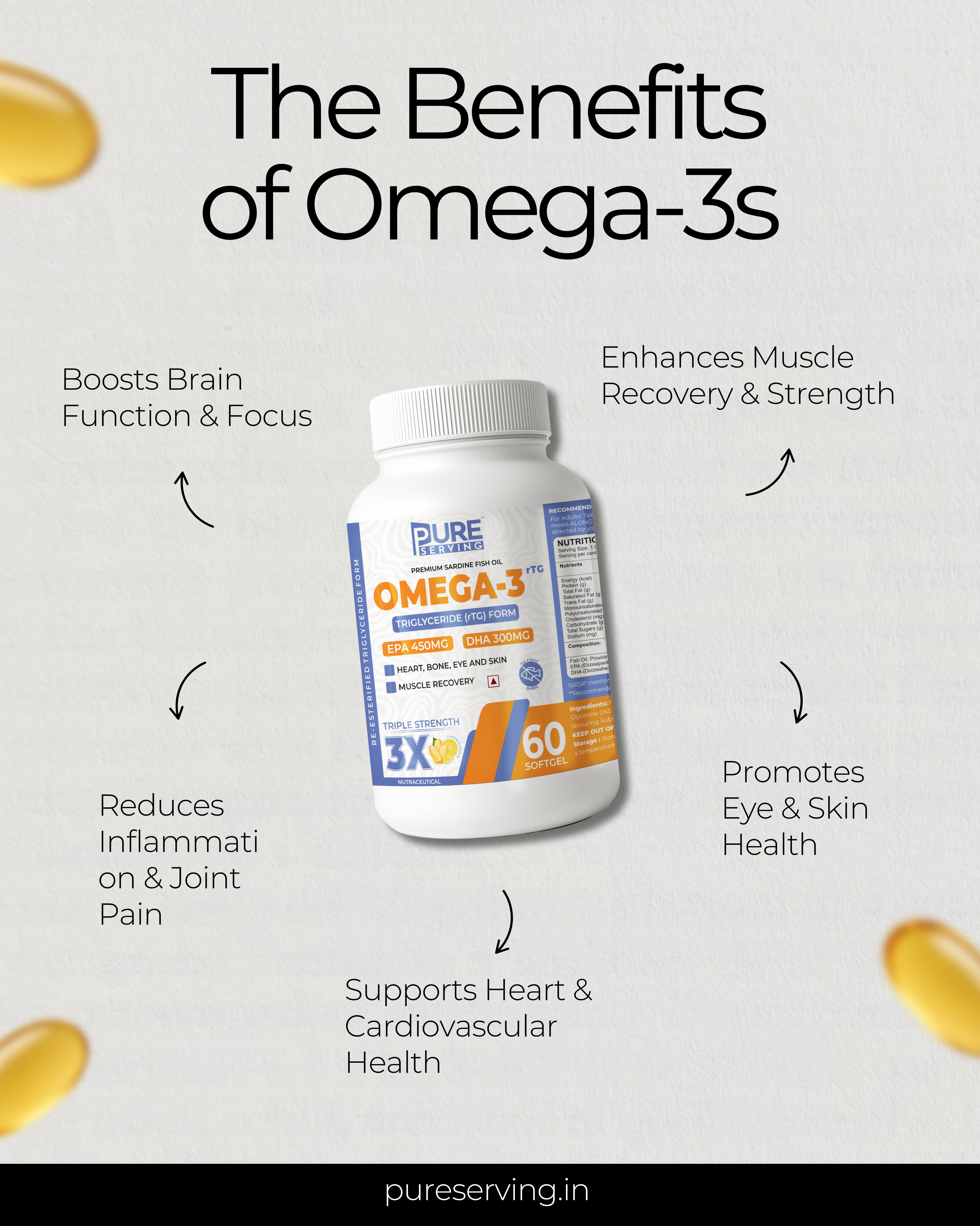 Pure Serving™ Omega-3 is crafted using premium sardine fish oil in Re-esterified Triglyceride (rTG) form for superior absorption and clinical-grade purity. Each lemon-flavored softgel delivers 450mg EPA + 300mg DHA, enriched with Vitamins D, E & K2-MK7 designed forheart, brain, joint, and immune health without the fishy aftertaste.